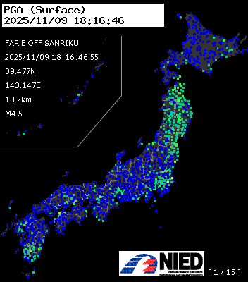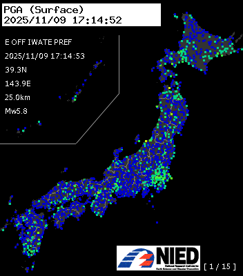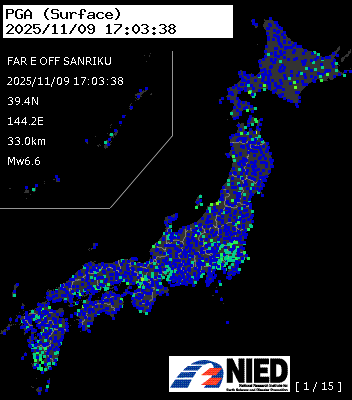 | 122 | 2025/11/09 17:34:00 | 三陸東方はるか沖 | 39.4N | 143.8E | 15.0km | M5.9 | AQUA-REAL |