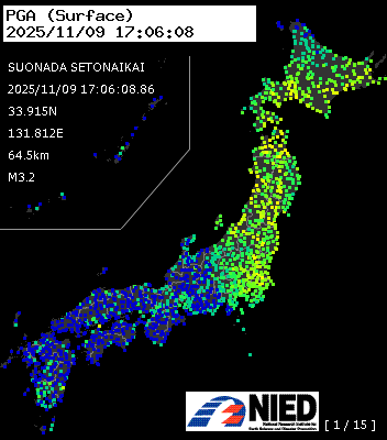 | 107 | 2025/11/09 17:06:08.86 | 周防灘 | 33.915N | 131.812E | 64.5km | M3.2 | — |