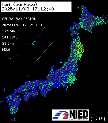 | 108 | 2025/11/09 17:12:01.51 | 仙台湾 | 37.924N | 141.074E | 31.3km | M3.6 | — |