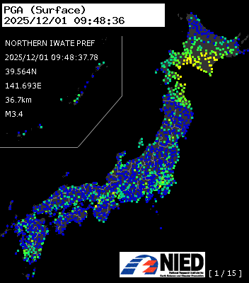 | 21 | 2025/12/01 09:48:37.78 | 岩手県北部 | 39.564N | 141.693E | 36.7km | M3.4 | — |