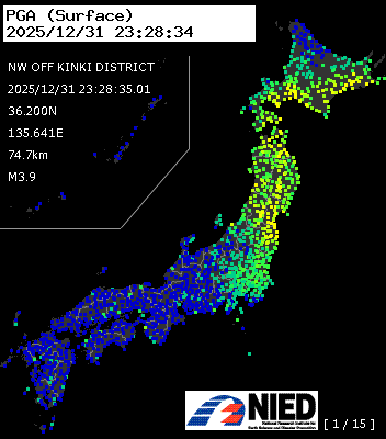| 47 | 2025/12/31 23:28:35.01 | 近畿地方北西沖 | 36.200N | 135.641E | 74.7km | M3.9 | — |