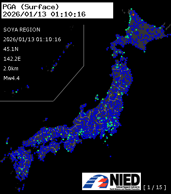 | 17 | 2026/01/13 01:58:53 | 宗谷地方 | 45.0N | 142.2E | 3.7km | M4.9 | AQUA-REAL |