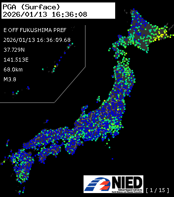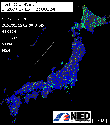 | 15 | 2026/01/13 01:58:53 | 宗谷地方 | 45.0N | 142.2E | 3.4km | M5.0 | AQUA-REAL |