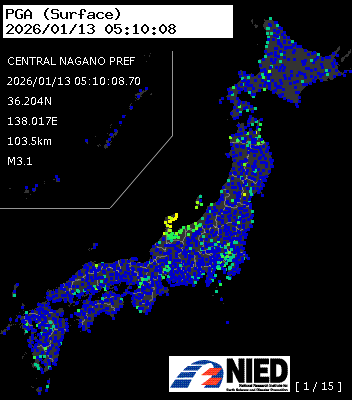 | 33 | 2026/01/13 05:10:08.70 | 長野県中部 | 36.204N | 138.017E | 103.5km | M3.1 | — |