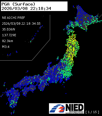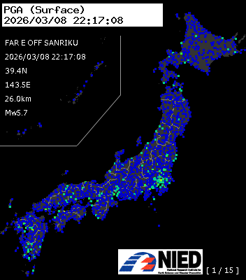 | 14 | 2026/03/08 22:08:30 | 三陸東方はるか沖 | 39.4N | 143.5E | 0.1km | M5.7 | AQUA-REAL |