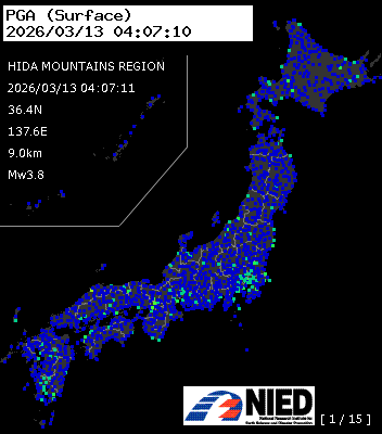 | 11 | 2026/03/13 04:25:18 | 飛騨山脈 | 36.4N | 137.6E | 9.0km | Mw4.1 | AQUA-CMT |