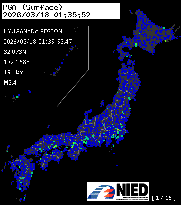| 1 | 2026/03/18 01:35:53.47 | 日向灘 | 32.073N | 132.168E | 19.1km | M3.4 | — |